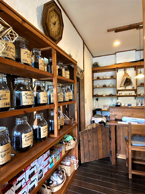 初めて入る焙煎珈琲の店<もっく>は、外から見るより奥行きもあり、コーヒーを焙煎する香りに満ちている。